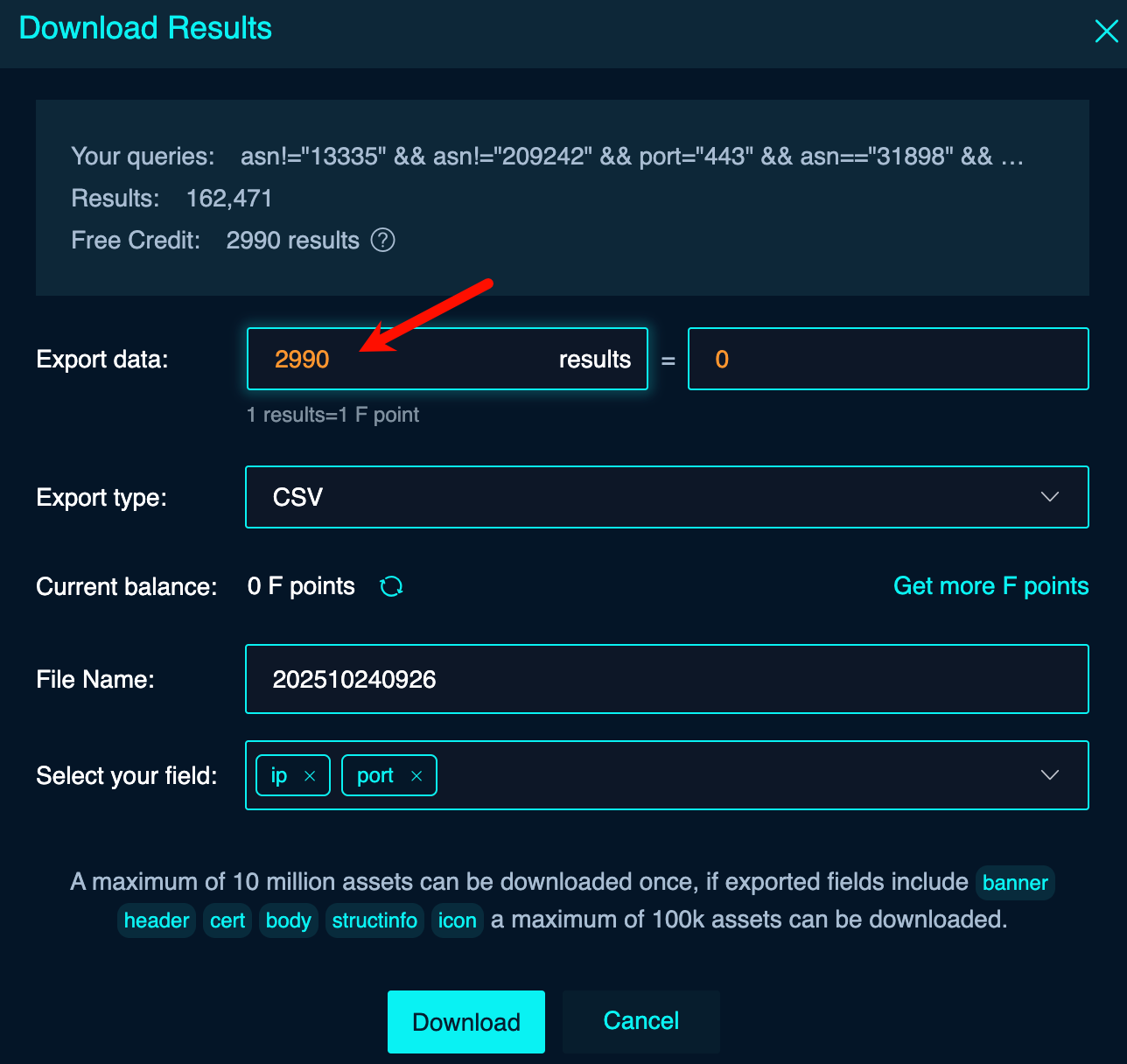 另外,由于FOFA每次下载的数量只有2990条,建议使用临时邮箱进行注册:临时邮箱,10分钟邮箱