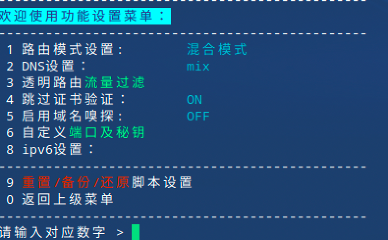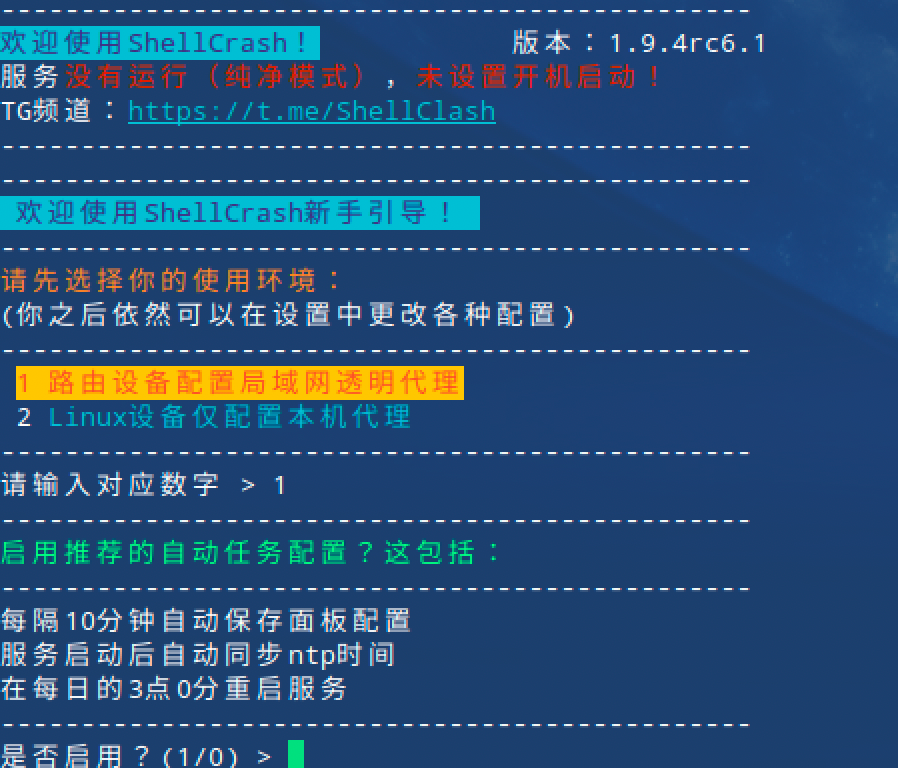 接着就可以在终端输入 sc 呼出ShellCrash面板,第一次会有引导模式,选择 1 路由设备配置局域网透明代理,后面的自动任务配置可以根据自身需求选择: