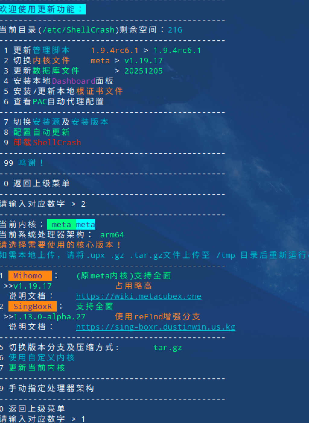 - 多内核支持:在 Shell 环境下便捷管理及切换 mihomo 与 sing-box 内核。