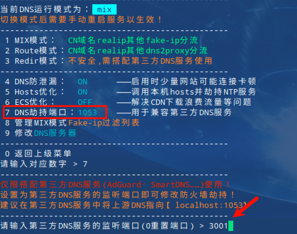 5.回到ShellCrash主界面-功能设置-dns设置-dns劫持端口,输入AdguardHome的dns监听端口3001